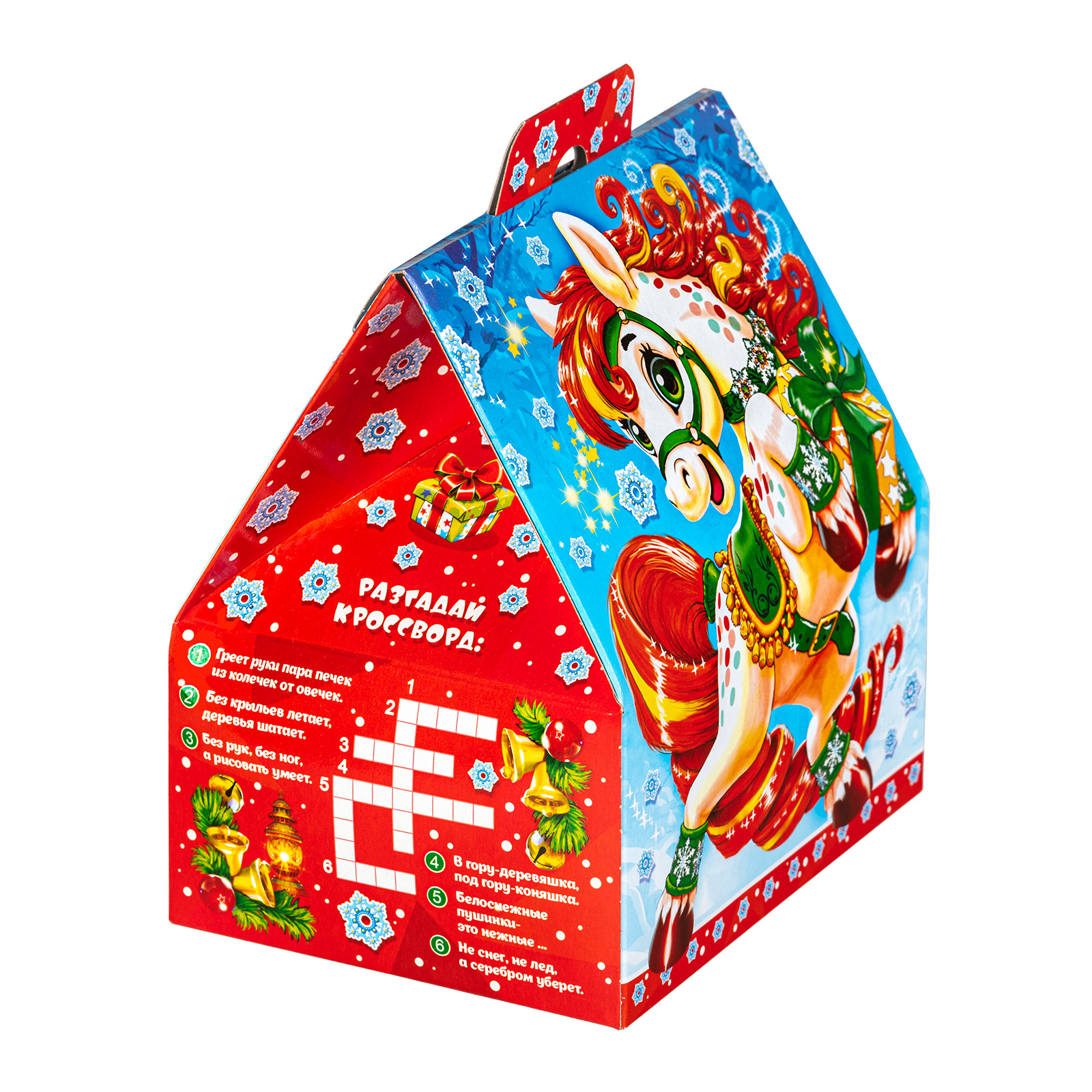 Новогодний сладкий подарок с изображением символа наступающего года - это беспроигрышный вариант под любое праздничное торжество. “Астра” -. это небольшая картонная коробочка с изображением веселой грациозной лошадки. Сверху имеется удобная прорезная ручка, а внутри этой коробки бережно хранятся вкусные и разнообразные сладости. Помимо угощений данный набор содержит небольшой памятный сувенир, а также сбоку есть мини-игра на внимательность и логику. Этот конфетный набор за счет компактных размеров и невысокой стоимости прекрасно подойдет для покупки в школы или детские сады - детки будут в восторге!
