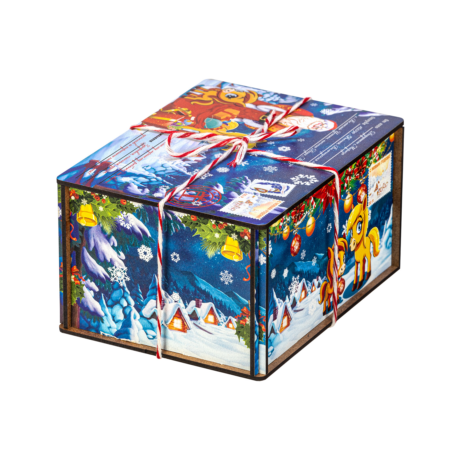 Интересный вариант новогоднего подарка – «Посылка от сказочной лошадки (Полезный состав)». Он представлен в разделе Дерево. Отлично подойдет на подарок в 2026 году с символом Лошадь. Внутри такого презента находится кондитерский набор весом 500 граммов.