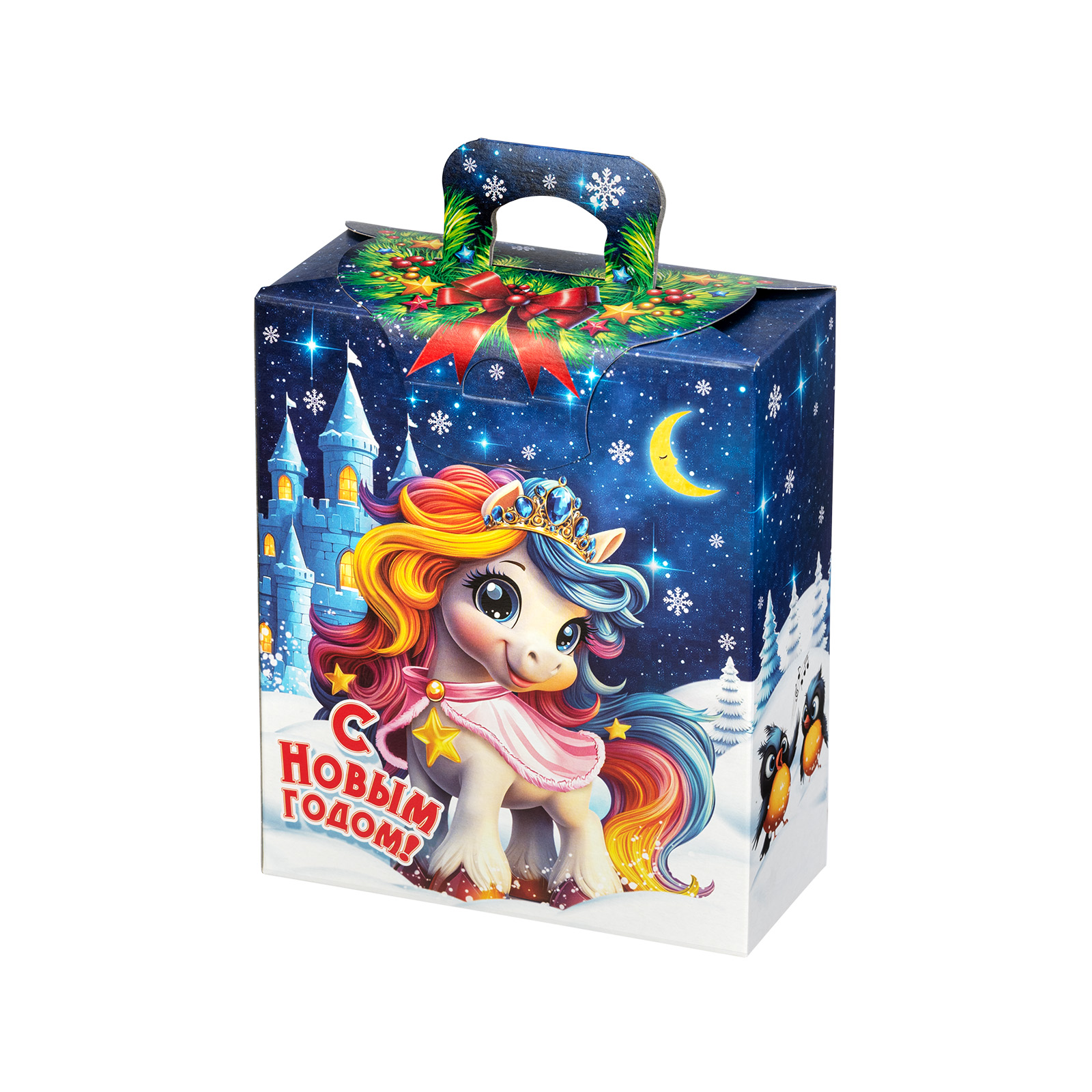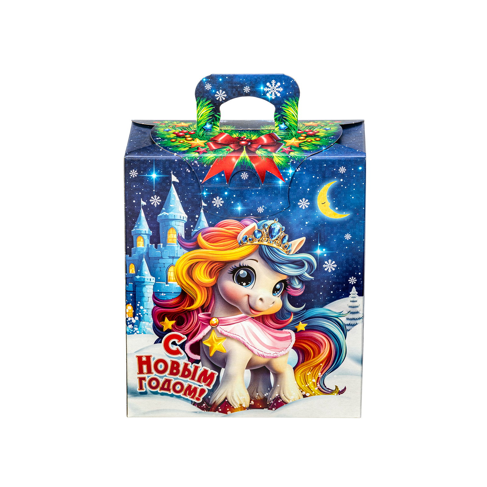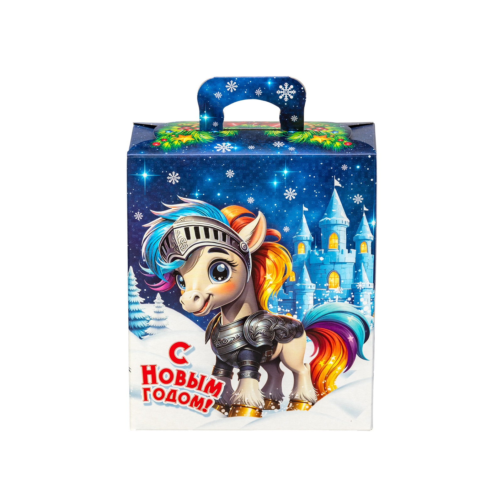 Новогодние каникулы - это то самое время, когда все фантазии могут сбыться” - именно такие мысли возникают при взгляде на этот чудесный подарочный набор. “Снежное фэнтези” - это прекрасный выбор новогоднего сладкого подарка для праздника в детском саду или начальной школе. Это компактная коробочка с ярким привлекательным рисунком и удобной ручкой. На фоне волшебной зимней ночи мы видим изображение символа наступающего года - чудесную маленькую лошадку с разноцветной гривой, которая приветливо улыбается нам. В состав подарка входит 600 грамм разнообразных сладостей, которых хватит на все запланированные новогодние чаепития со всей семьей.