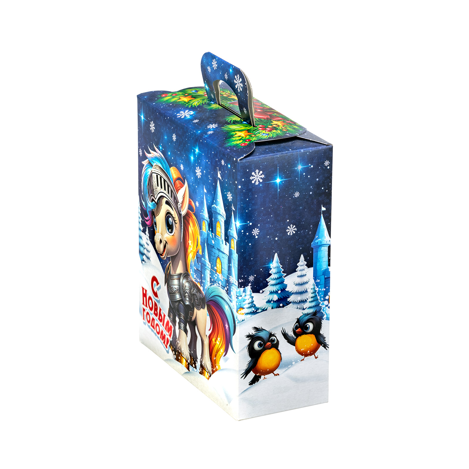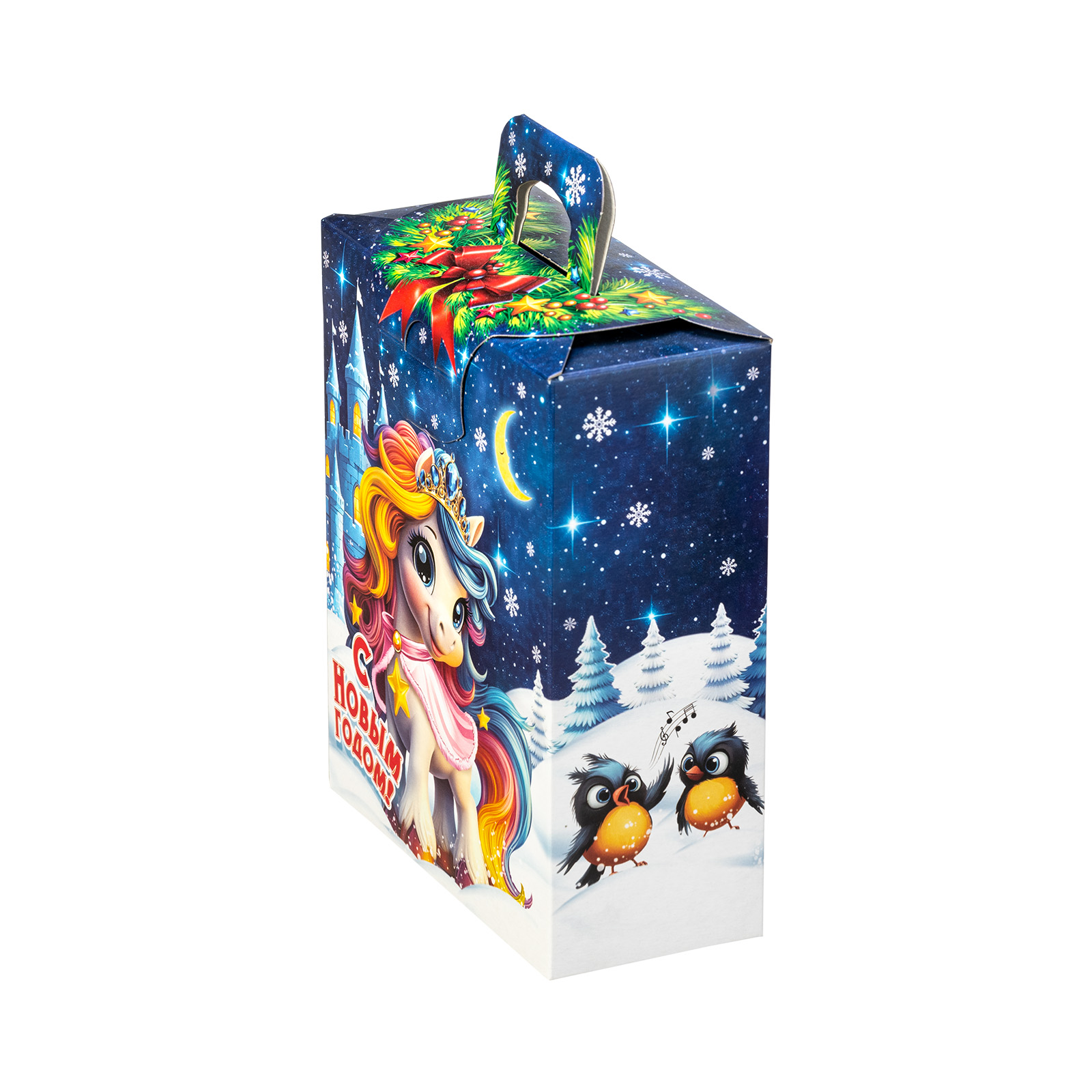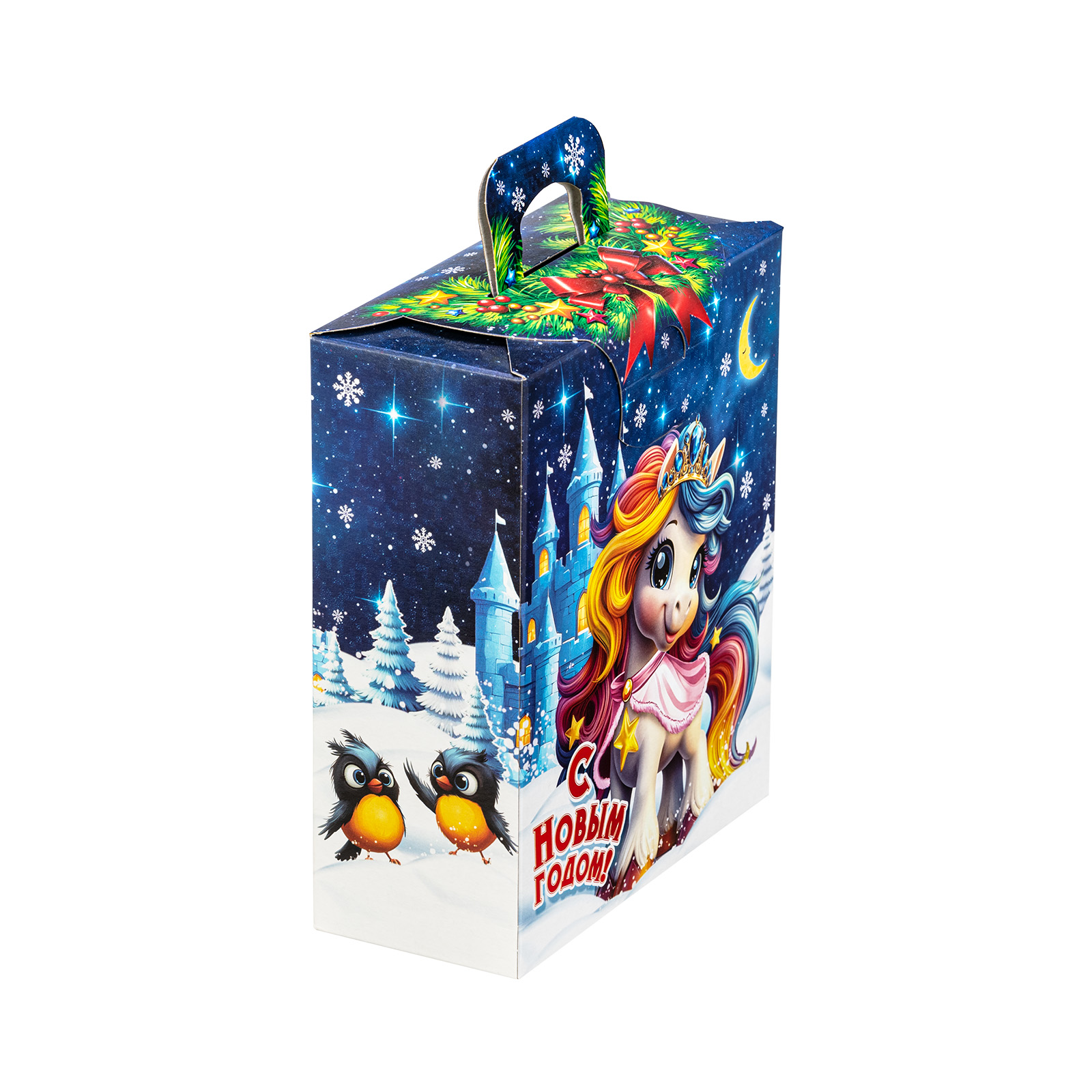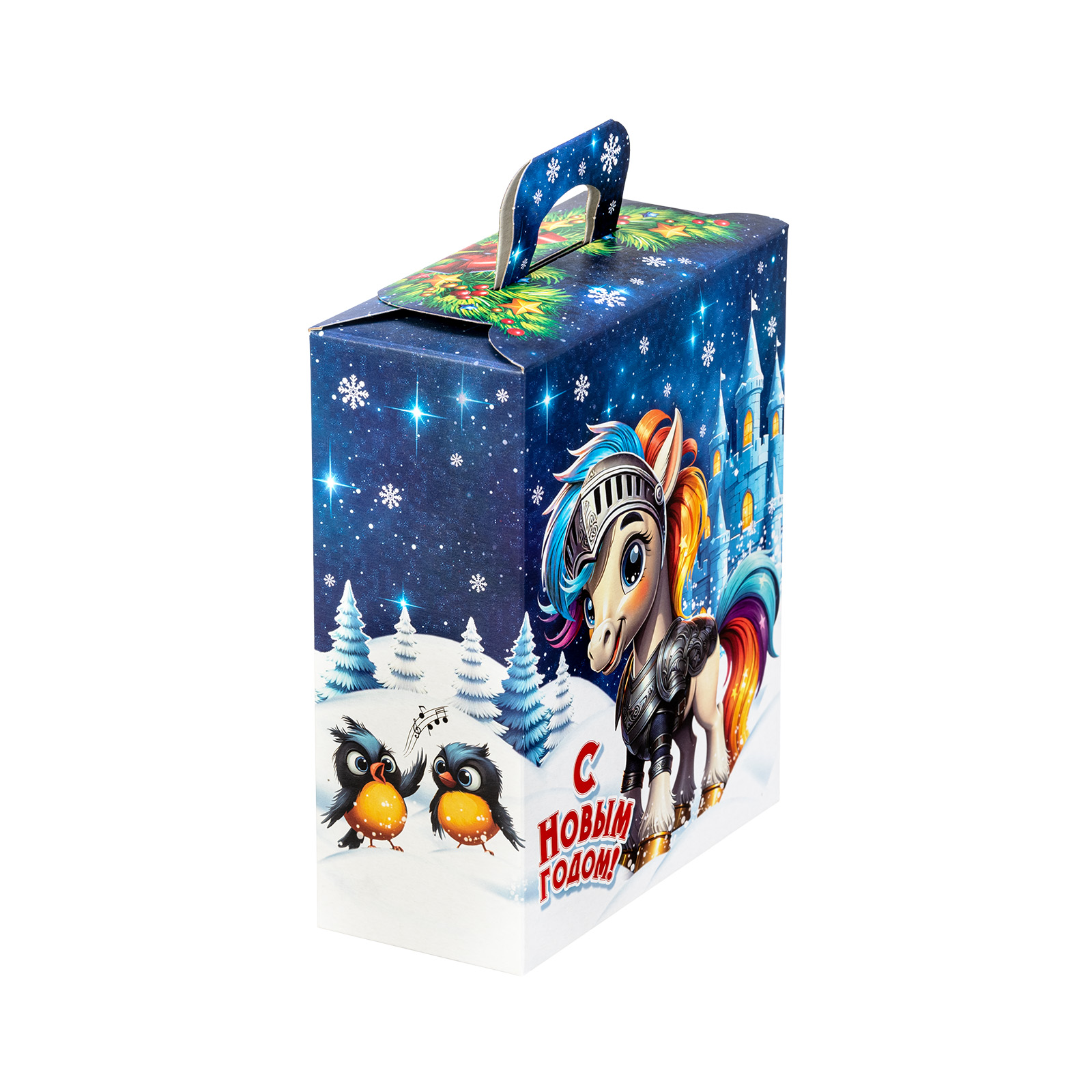 Новогодние каникулы - это то самое время, когда все фантазии могут сбыться” - именно такие мысли возникают при взгляде на этот чудесный подарочный набор. “Снежное фэнтези” - это прекрасный выбор новогоднего сладкого подарка для праздника в детском саду или начальной школе. Это компактная коробочка с ярким привлекательным рисунком и удобной ручкой. На фоне волшебной зимней ночи мы видим изображение символа наступающего года - чудесную маленькую лошадку с разноцветной гривой, которая приветливо улыбается нам. В состав подарка входит 600 грамм разнообразных сладостей, которых хватит на все запланированные новогодние чаепития со всей семьей.