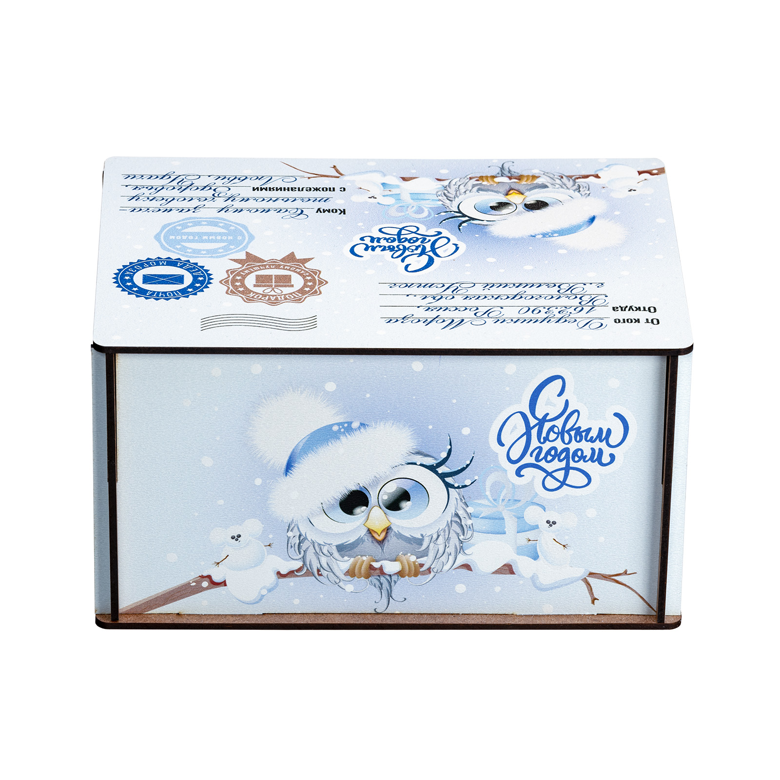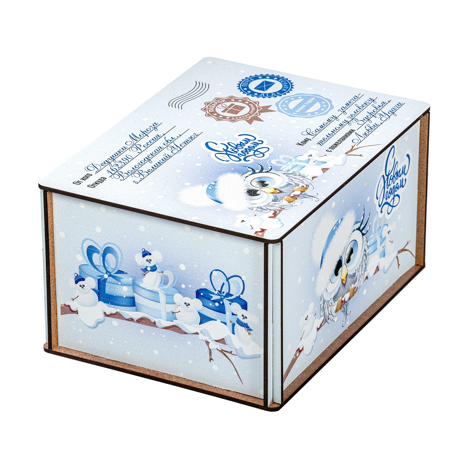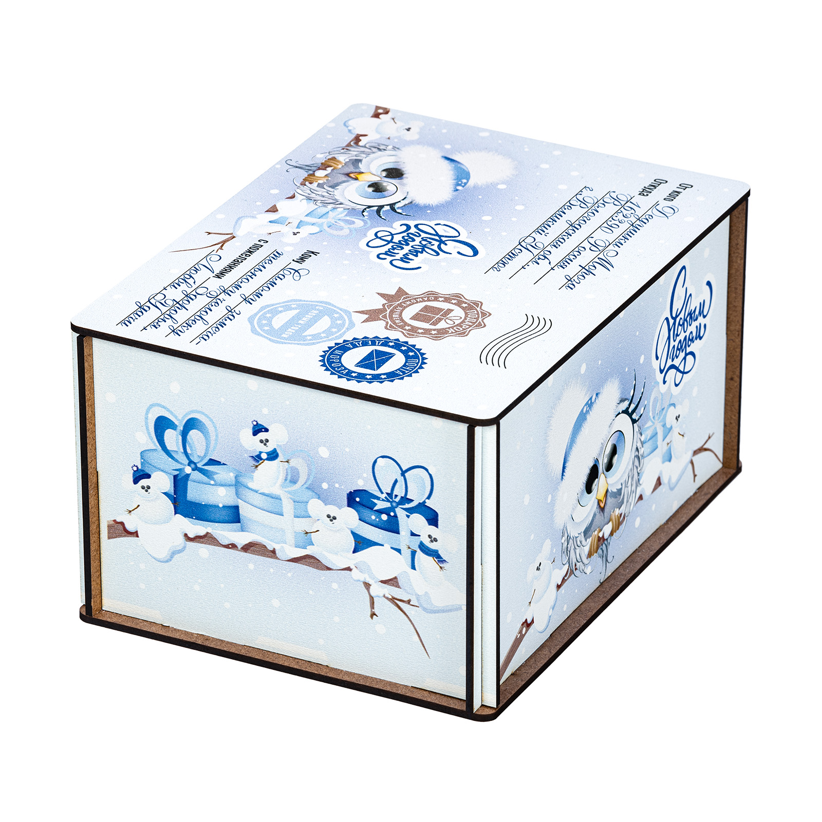 Новогодние сладкие подарки в виде небольшого деревянного ящика - это прекрасный вариант презента для взрослого сластены. Ведь таким образом можно даже самого строгого и делового человека на миг перенести в светлое и беззаботное детство. Набор “Совушки”  - это небольшая деревянная бандероль нежно-голубого цвета, украшенная со всех сторон рисунками с очаровательными совятами в милых зимних шапочках. Крышка этой бандероли оформлена под самую настоящую посылку: там указан и отправитель, и получатель, и даже все печати на месте! А что же внутри посылки? Там находятся вкусные и разнообразные сладости, с которыми любое чаепитие в новогодние праздники станет самым настоящим сказочным торжеством!