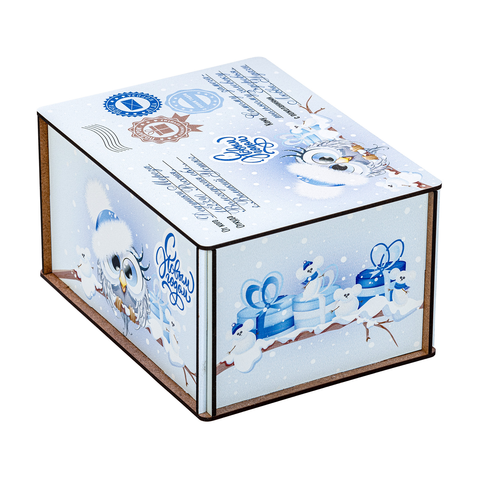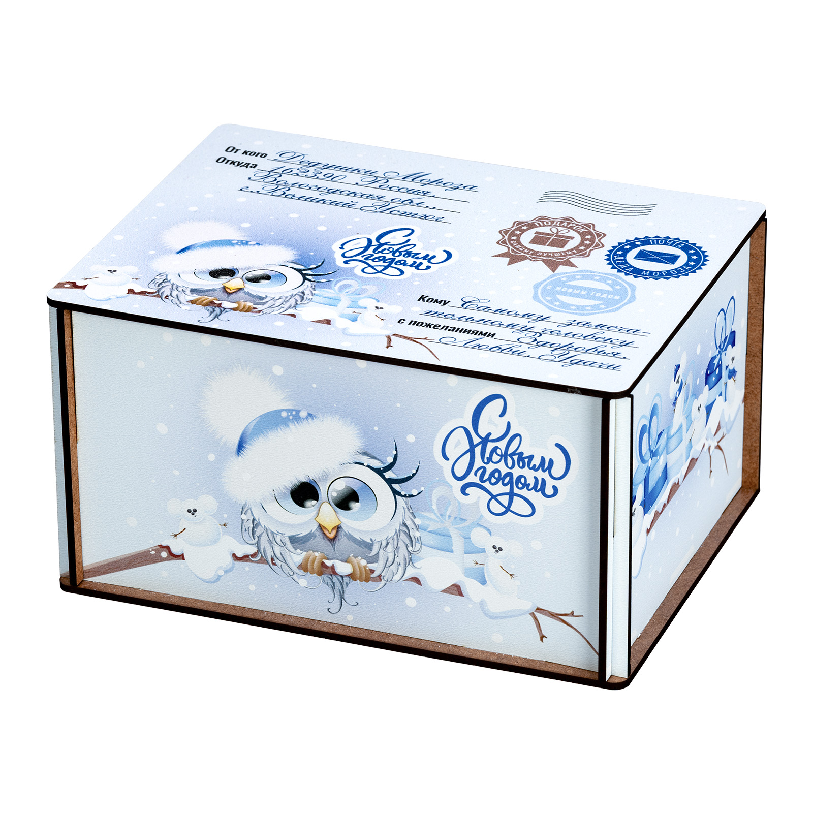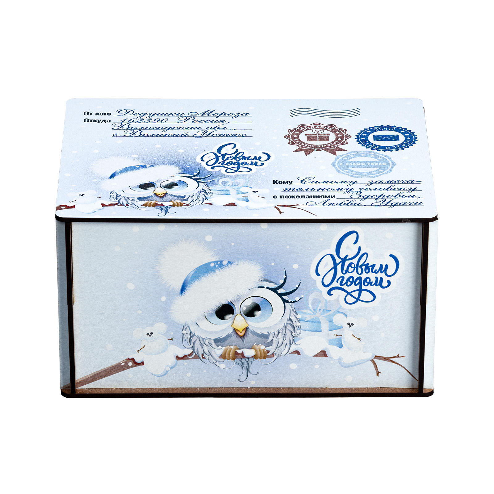 Новогодние сладкие подарки в виде небольшого деревянного ящика - это прекрасный вариант презента для взрослого сластены. Ведь таким образом можно даже самого строгого и делового человека на миг перенести в светлое и беззаботное детство. Набор “Совушки”  - это небольшая деревянная бандероль нежно-голубого цвета, украшенная со всех сторон рисунками с очаровательными совятами в милых зимних шапочках. Крышка этой бандероли оформлена под самую настоящую посылку: там указан и отправитель, и получатель, и даже все печати на месте! А что же внутри посылки? Там находятся вкусные и разнообразные сладости, с которыми любое чаепитие в новогодние праздники станет самым настоящим сказочным торжеством!