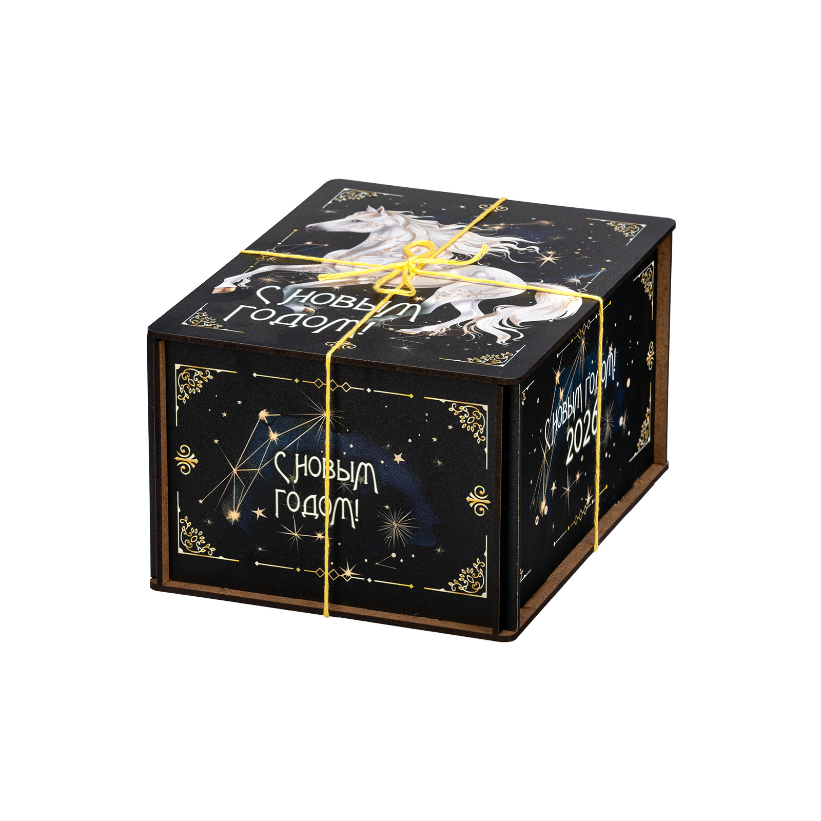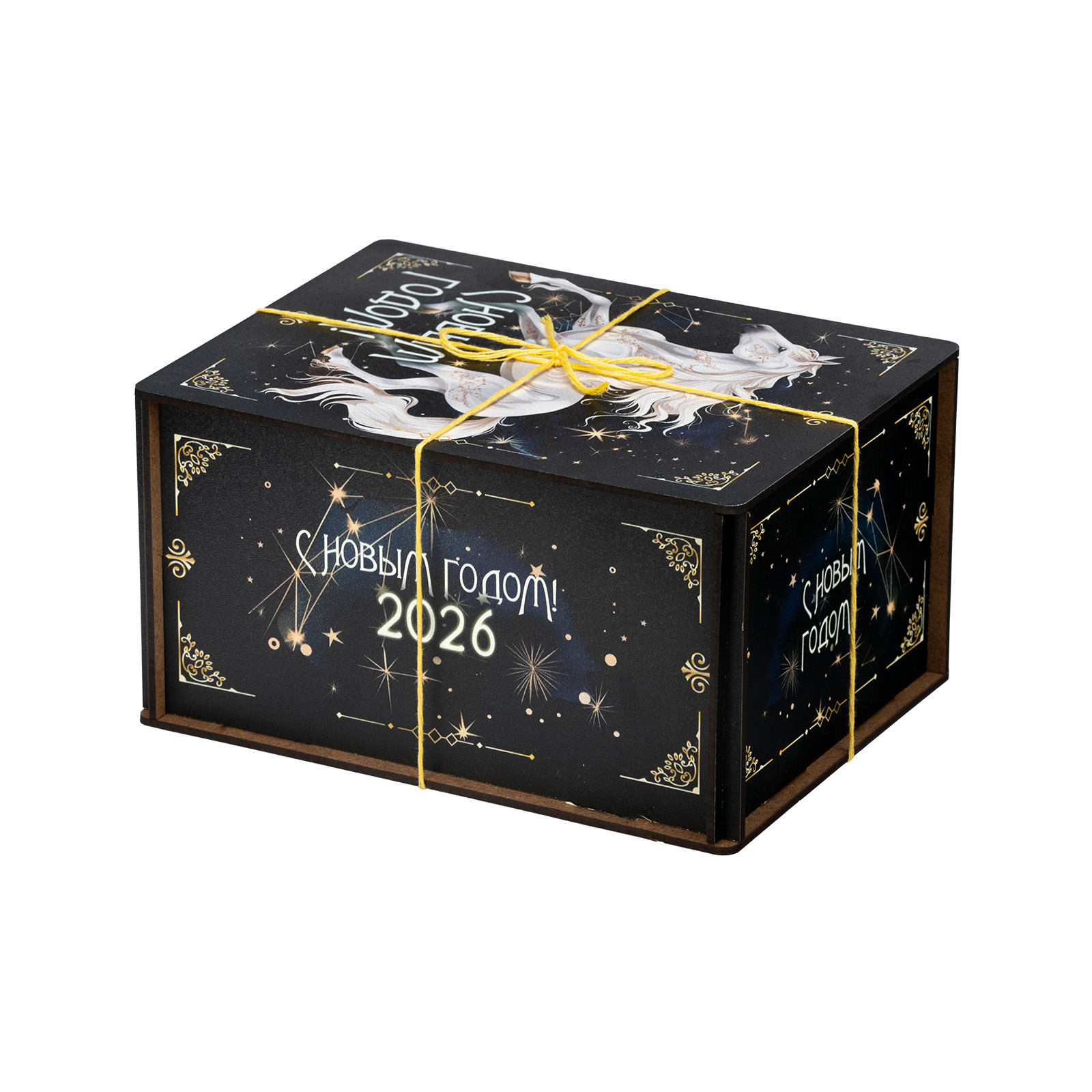 Новогодние сладкие подарки с изображением символа наступающего года всегда пользуются спросом! “Созвездие коня” - это конфетный набор, помещенный в небольшой деревянный ящичек. Упаковка оформлена в темные тона, разбавленные небольшими контрастными элементами: яркой веревочкой, небольшими орнаментами и поздравительными надписями. На крышке подарка находится большое изображение символа наступающего года - белоснежного благородного коня, который словно парит по ночному небу. За счет такого исполнения подарок подойдет для вручения подростку или взрослому. В состав набора входят вкусные сладости и небольшой памятный сувенир в виде символа 2026 года.