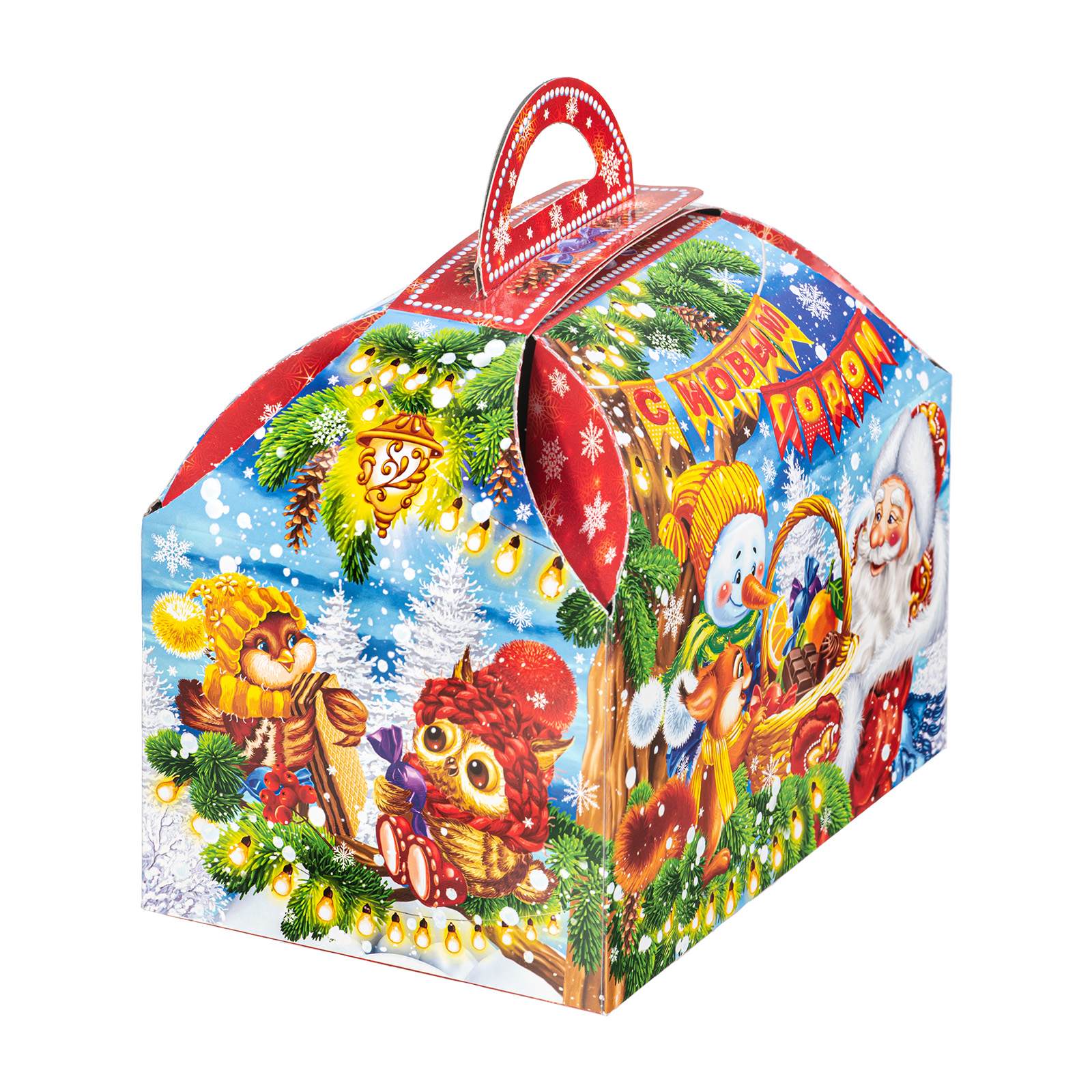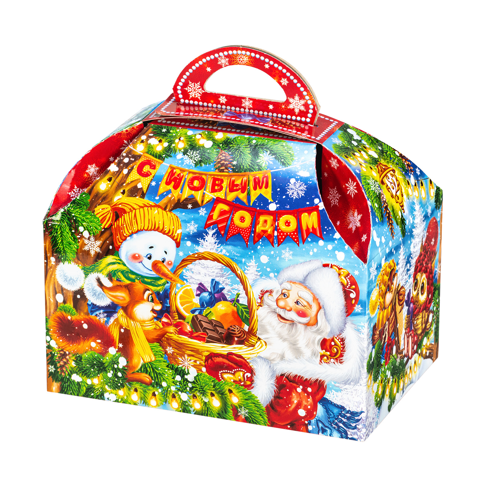 Подарите своим родным и близким безграничную радость вместе с новогодним сладким подарком “Сундук лакомств”. Этот подарочный набор представляет собой небольшую картонную коробочку в форме сундука с удобной ручкой сверху. На упаковке нанесен очень яркий привлекательный рисунок, на котором Дед Мороз и его друзья обмениваются подарками и веселыми улыбками. В состав подарка входит 900 грамм вкусных и разнообразных лакомств от ведущих кондитерских предприятий,  а также небольшой памятный сувенир в виде символа наступающего года.